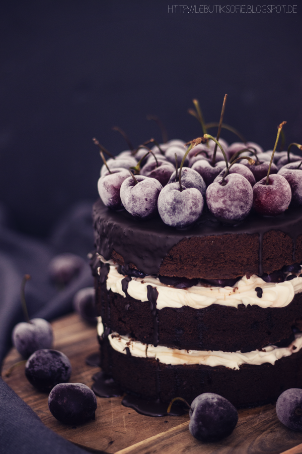 Vor dem Servieren mit Zartbitter Guss und gefrorenen Kirschen dekorieren.